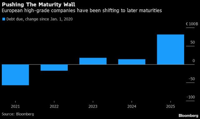 European companies are kicking the debt can further down the road. Investment grade debt is now substantially weighted to a longer time frame, with the largest shift reallocating towards a 2025 maturity date.