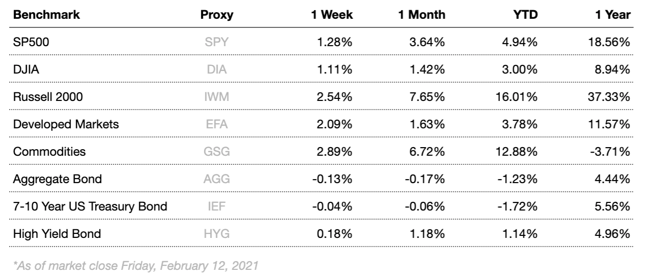 Markets rose this week as inflation remained muted and the dollar weakened. Market CPI came in at expectations, while core CPI did not change month over month. Unemployment claims came in above expectations, revealing a labor market which is still struggling to build positive momentum. On the federal stimulus front, the $1.9 trillion package being proposed by democrats is receiving strong resistance from republicans and even some moderate democrats. Oppositionists to the bill are against the size of the package as well as some specific provisions such as a federal minimum wage increase to $15 an hour. On the COVID-19 front, U.S. infections continue to recede at an encouragingly fast pace. The 7 day moving average has dropped to below 100K daily infections for the first time since early November, and is poised to be at late summer infection levels in a matter of weeks if current trends hold.
