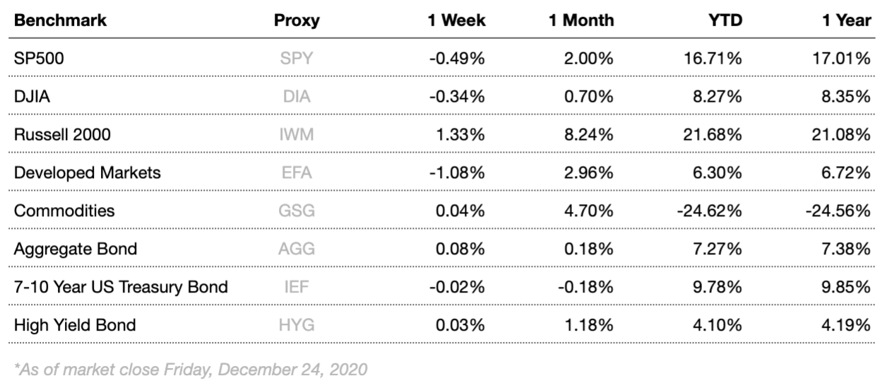 Stocks fell slightly even as a $900 billion stimulus was signed. Congress continues to argue about further direct payments to Americans, making the final week of 2020 crucial for passing legislation quickly. Economic data was sparse this week, but still revealed better than expected unemployment claims. The U.S. has begun vaccinating health professionals and at-risk individuals with millions of doses set to be distributed before the end of the year. The persistently high and increasing case rates of COVID-19 in the U.S. remain concerning, but with vaccines being administered, hopefully normal economic activity can resume sooner than later.