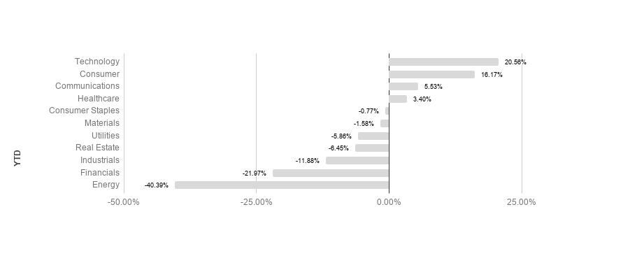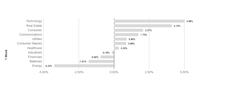 Broad market equity indices finished the week mixed, with major large cap indices outperforming small cap. Economic data has continued to be mostly positive, but the global recovery still has a long way to go to regain lost jobs and output. S&P sectors returned mixed results this week, as broad market movements showed investors favoring defensive sectors. Technology and real estate led the best performing sectors, returning 4.98% and 4.19% respectively. Materials and energy performed the worst, posting -1.81% and -4.23% respectively. Technology leads the pack so far YTD, returning 20.56% in 2020.