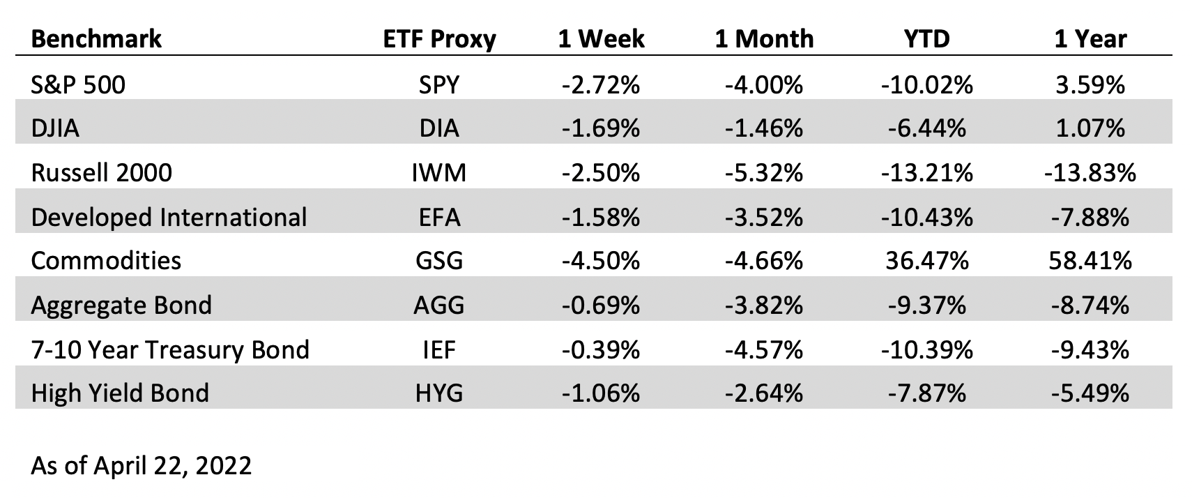 US equities declined this week as communication from the Federal Reserve remained very hawkish. Last week we highlighted the Consumer Price Index (CPI) and Producer Price Index (PPI) inflation numbers. The CPI rose to 8.5% year-over-year, the fastest annual rate since 1981. Produce Price Index inflation numbers were even steeper at just over 11% year-over-year, also multi-decade highs.