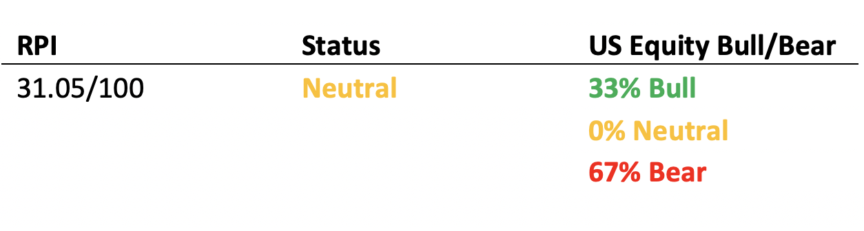 Briefly, we want the RPI to be low on a scale of 1 to 100. For the US Equity Bull/Bear indicator, we want it to read at least 66.67% bullish. When those two things occur, our research shows market performance is typically stronger, with less volatility.