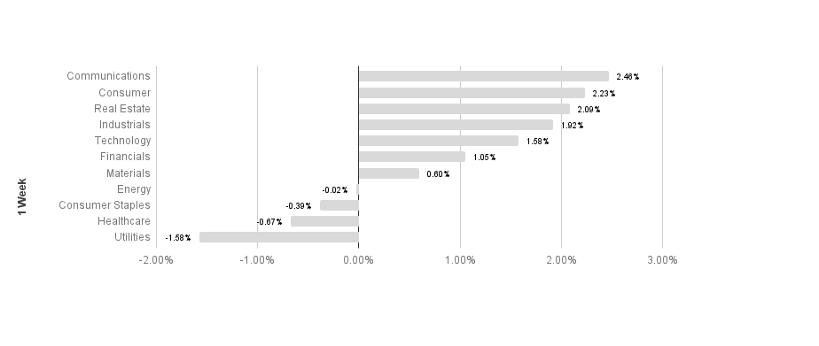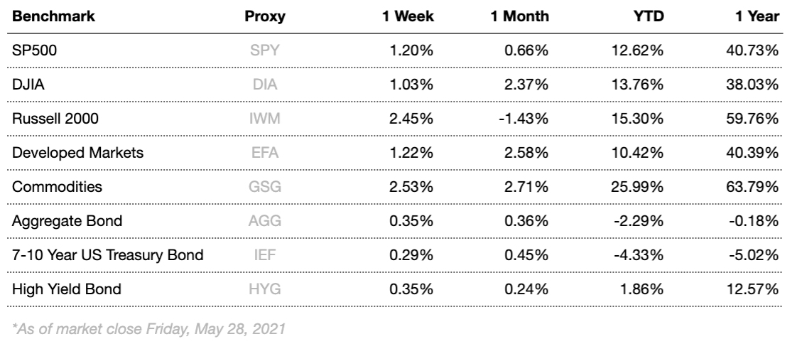 Broad market equity indices finished the week positive, with major large cap indices underperforming small cap. Economic data has been mostly encouraging, but the global recovery has a long way to go to recover from COVID-19 lockdowns. S&P sectors returned mixed results this week. Communications and consumer discretionary outperformed, returning 2.46% and 2.23% respectively. Healthcare and utilities underperformed, posting -0.67% and -1.58% respectively. Energy maintains its lead in 2021 with a 36.23% return.