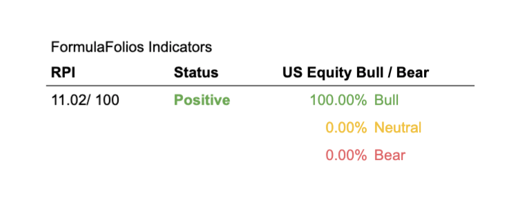 The Recession Probability Index (RPI) has a current reading of 11.02, forecasting a lower potential for an economic contraction (warning of recession risk). The Bull/Bear indicator is currently 100% bullish, meaning the indicator shows there is a slightly higher than average likelihood of stock market increases in the near term (within the next 18 months).