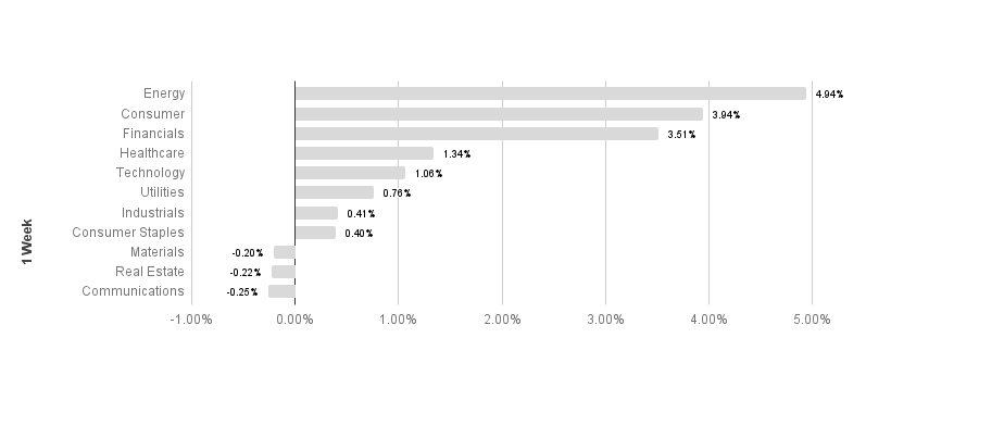 S&P sectors were mixed this week. Energy and consumer discretionary outperformed, returning 4.94% and 3.94% respectively. Real estate and communications underperformed, posting -0.22% and -0.25% respectively. Energy holds the lead YTD, posting 24.30%.