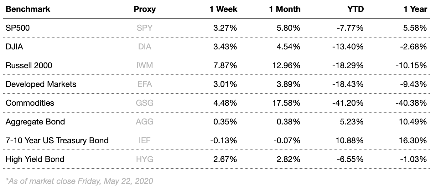 Broad market equity indices finished the week up, with major large cap indices underperforming small cap. Economic data mostly came in above expectations this week and the first steps needed to see leveling out are being taken, as multiple U.S. states have reopened their economies and more are poised to do the same this month.S&P sectors returned almost unanimously positive results this week, as broad market movements showed investors buying into almost all sectors. Industrials led the best performing sectors, followed by energy, returning 7.2% and 6.11% respectively. Consumer staples and healthcare performed the worst, posting 0.25% and -0.78% respectively. Technology leads the pack so far YTD, returning 5.17% in 2020.