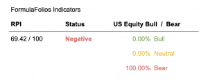 In a nutshell, we want the RPI to be low on the scale of 1 to 100. For the US Equity Bull/Bear indicator, we want it to read least 66.67% bullish. When those two things occur, our research shows market performance is strongest and least volatile.