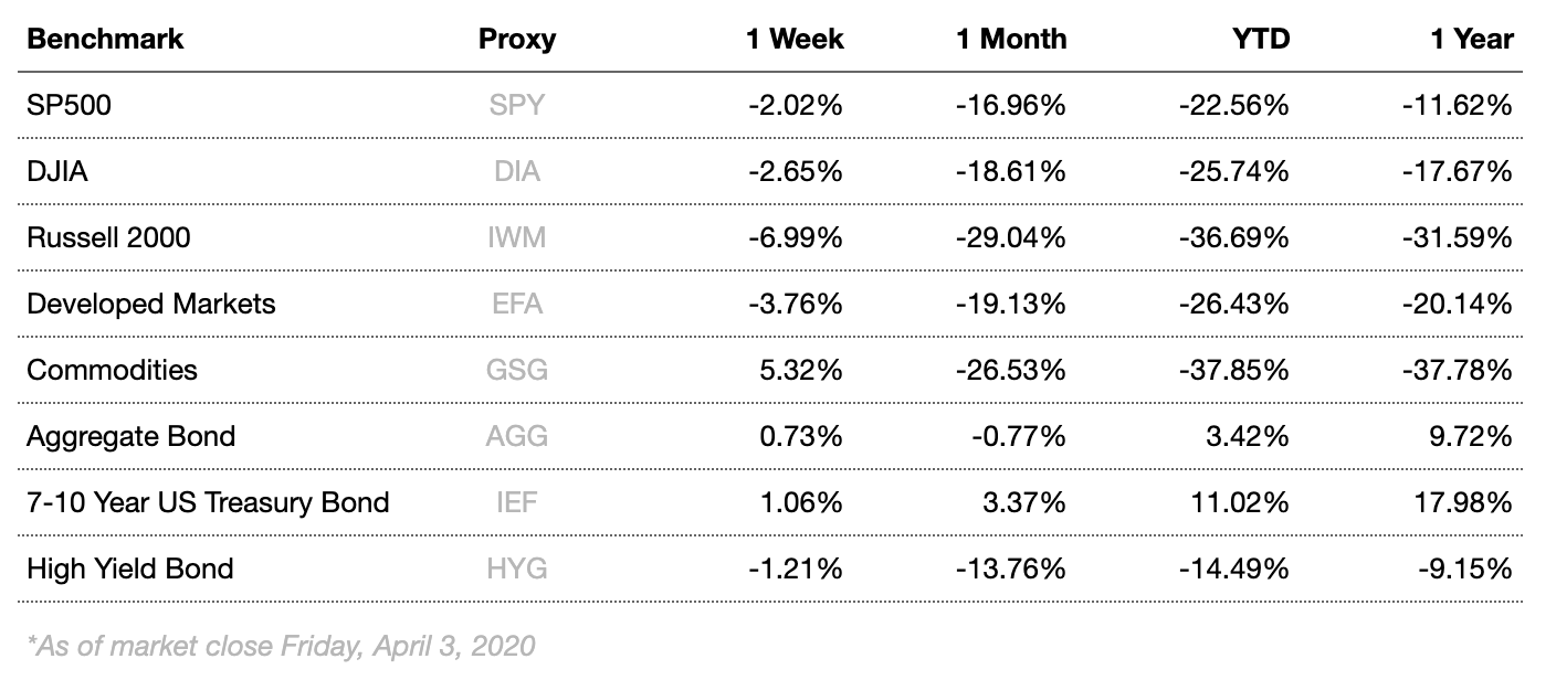 Markets fell slightly this week as the novel coronavirus Covid-19 continued its spread, as shutdowns and quarantines remained around the globe. After equities initially responded favorably to the passing of a $2.2 trillion federal stimulus package, investors tempered their positive outlooks in light of the rising cost of economic damages. Sectors diverged widely from each other this week as investors continue to jockey in their search for value. Energy led the S&P sectors this week, finishing ahead of consumer staples and healthcare to round out the strongest sectors. Investors are constantly adjusting to new information, creating an environment with dramatic price swings. After markets reversed a sharply negative outlook to return to an oBrookstonecial bull market just last week, assets fell this week in response to higher than expected unemployment numbers. Public anxiety remains as the virus continues to spread. U.S. unemployment filings set an ominous new record this week beating the prior week, as now 6.6 million Americans have filed unemployment claims as a result of the economic shutdowns. Supply chains, store-front businesses, and consumer activity remain under pressure. Recent positive developments have assisted investor efforts to determine market impact as the government has recently announced the completion and delivery of new testing technology to help diagnose and isolate those infected with the disease.
