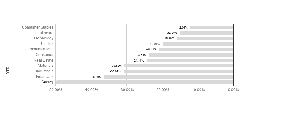 Broad market equity indices finished the week down, with major large cap indices outperforming small cap. Recent fears returned this week, as prices fell in response to rising unemployment claims. Other economic data has come in above expectations, as both consumer confidence and manufacturing PMI (purchasing managers index) surprised analysts, possibly providing encouragement surrounding the market as a whole. S&P sectors returned mixed results this week, as broad market movements showed investors shifting between sectors. Energy and consumer staples led the best performing sectors returning 5.38% and 3.46% respectively. Financials and utilities performed the worst, posting -6.78% and -7.11% respectively. Consumer staples now leads the pack so far YTD, returning -12.04% in 2020.