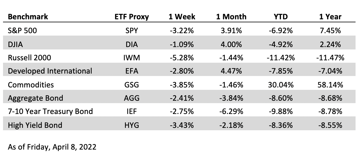 Broad market equity indices finished broadly lower on the week with small cap stocks, and growth stocks leading the decline.Small cap and growth stocks are typically sensitive to rising interest rates.