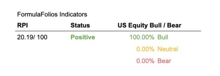 The Recession Probability Index (RPI) has a current reading of 20.19, forecasting a lower potential for an economic contraction (warning of recession risk). The Bull/Bear indicator is currently 100% bullish, meaning the indicator shows there is a slightly higher than average likelihood of stock market increases in the near term (within the next 18 months).