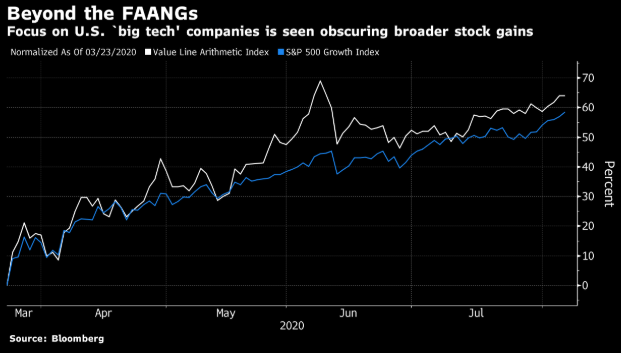 While big name tech stocks like Amazon and Microsoft make up 39% of the S&P 500 growth index and attract much of the spotlight, it’s helpful to see that other companies are displaying broad recovery as well. Excluding the FAANG stocks (Facebook, Amazon, Apple, Netflix, and Google) and Microsoft, the broad market as a whole is still recovering well.