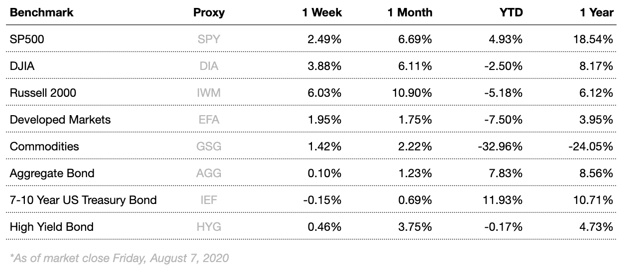 Markets were encouraging this week, with equity indices bringing mostly positive returns. Fears concerning global stability and health are an unexpected factor in asset values, and the recent volatility serves as a great reminder of why it is so important to remain committed to a long-term plan and maintain a well-diversified portfolio. When stocks were struggling to gain traction last month, other asset classes such as gold, REITs, and US Treasury bonds proved to be more stable. Flashy news headlines can make it tempting to make knee-jerk decisions, but sticking to a strategy and maintaining a portfolio consistent with your goals and risk tolerance can lead to smoother returns and a better probability for long-term success.