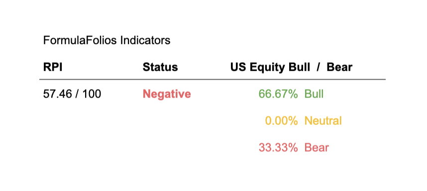 In a nutshell, we want the RPI to be low on a scale of 1 to 100. For the US Equity Bull/Bear indicator, we want it to read at least 66.67% bullish. When those two things occur, our research shows market performance is typically stronger, with less volatility.