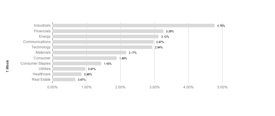 Broad market equity indices finished the week up, with major large cap indices underperforming small cap. Economic data has continued to be mostly positive, but the global recovery still has a long way to go to regain lost jobs and output. S&P sectors returned positive results this week, as broad market movements showed investors buying into all sectors. Industrials and financials led the best performing sectors, returning 4.76% and 3.26% respectively. Healthcare and real estate underperformed, posting 0.86% and 0.67% respectively. Technology leads the pack so far YTD, returning 24.10% in 2020.