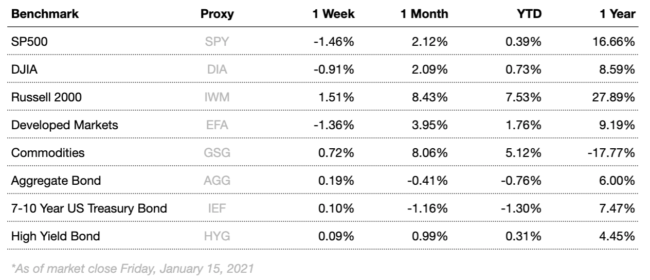 Markets receded this week as December retail sales numbers disappointed. Consensus expectations were for the retail segment to be flat month over month, but sales shrunk further, adding further concern to forecasts that are warning of a stalled economic recovery. Many politicians are asserting that the economy needs more stimulus to fully overcome the pandemic lockdowns, which could lead to further fiscal stimulus. The COVID-19 infection is continuing to spread across the world, but at decreasing rates this week, possibly indicating that policies and vaccines are having a positive effect.