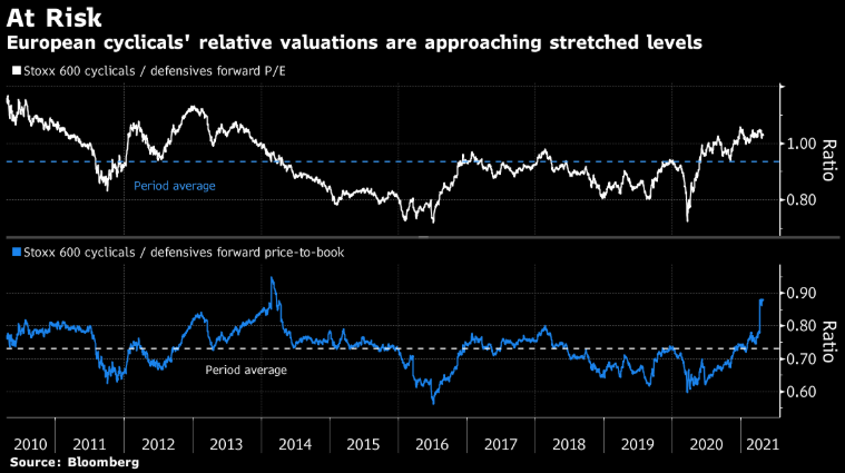 Investors have taken a very bullish view on European cyclicals recently, driving valuation ratios between cyclicals and defensives to levels not seen in years. Some analysts worry that this could be overvaluation, while others believe it could be a prelude to a robust recovery in Europe.