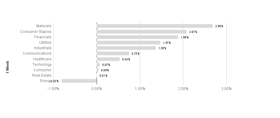 Broad market equity indices finished the week mixed, with major large cap indices outperforming small cap. Economic data has been mostly encouraging, but the global recovery has a long way to go to recover from COVID-19 lockdowns. S&P sectors were mostly positive this week. Materials and consumer staples outperformed, returning 2.68% and 2.07% respectively. Real estate and energy underperformed, posting 0.01% and -0.82% respectively. Financials have taken the lead in 2021 with a 30.57% return.