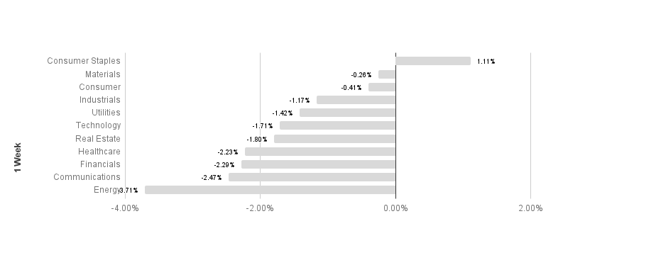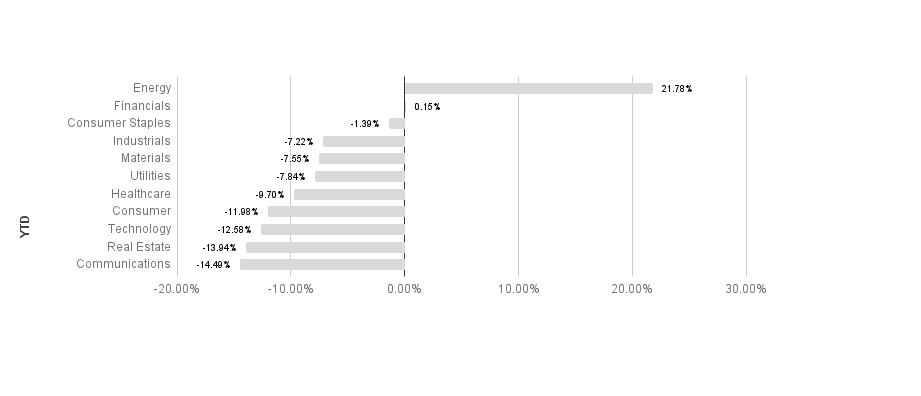 S&P sectors were mostly negative this week. Consumer staples and materials outperformed, returning 1.11% and -0.26% respectively. Communications and energy underperformed, posting -2.47% and -3.71% respectively. Energy holds the lead YTD, posting 21.78%.