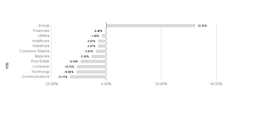 S&P sectors were mostly positive this week. Consumer discretionary and technology outperformed, returning 9.27% and 7.87% respectively. Utilities and energy underperformed, posting 0.52% and 3.58% respectively. Energy holds the lead YTD, posting 32.42%.