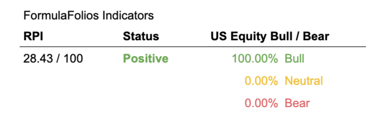 The Recession Probability Index (RPI) has a current reading of 28.43, forecasting a lower potential for an economic contraction (warning of recession risk). The Bull/Bear indicator is currently 100% bullish, meaning the indicator shows there is a slightly higher than average likelihood of stock market increases in the near term (within the next 18 months).