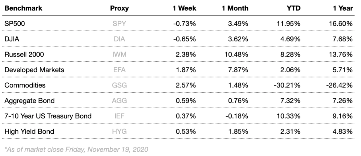 Stocks were mixed this week as pharmaceutical company Moderna became the second company in as many weeks to have a high success rate with their COVID-19 vaccine trials. Globally, COVID-19 infections continue to increase. New daily infections in the U.S. remain above 100K. Economic data was mixed this week with retail sales coming in under expectations, but with housing and manufacturing beating expectations. Unemployment claims have been choppy but moving downwards, likely indicating slowly recovering labor markets. Recently, unemployment declines have slowed somewhat, prompting questions as to whether or not the recovery may be coming to a halt. The persistently high and increasing case rates of COVID-19 in the U.S. remain concerning, and restrictive measures have begun being reinstated in some areas. The increase in cases has been statistically correlated with schools reopening, and as the flu season sets in transmission rates may increase even further.