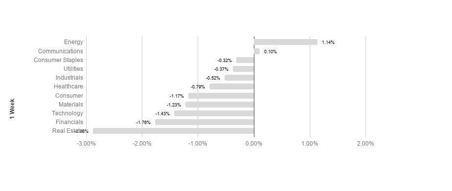 Broad market equity indices finished the week mixed, with major large cap indices underperforming small cap. Economic data has been solid, but the global recovery has a long way to go to recover from COVID-19 lockdowns. S&P sectors returned mostly negative results this week. Energy and communications outperformed, returning 1.14% and 0.10% respectively. Financials and real estate underperformed, posting -1.76% and -2.88% respectively. Technology leads the pack so far YTD, returning 35.44% in 2020.