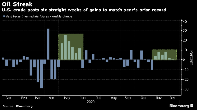 U.S. oil futures have performed well as of late, notching six consecutive weeks of positive gains. Oil has been on a rollercoaster ride this year, with prices at one point even dipping into negative territory. From all time lows in the spring, prices have gradually recovered, with prices down about -17% YTD.