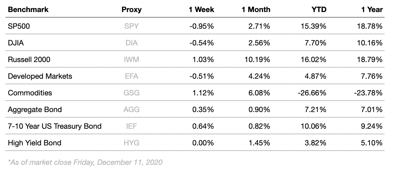 Stocks fell this week even as consumer sentiment beat expectations and the world started implementing vaccination efforts. In the U.S., Pfizer's COVID-19 vaccine is oBrookstonecially en route to nursing homes and frontline healthcare workers, and is being given priority shipping by FedEx and UPS to help expedite delivery. CVS and Walgreens pharmacies will be instrumental in delivering the vaccines, and plan to begin administering doses in nursing homes in the coming week. Rapidly progressing vaccination efforts are a welcome development as globally, COVID-19 infections continue to increase. New daily infections in the U.S. remain stubbornly high, and new infections remained above the 200K mark for most of the week. Economic data was sparse this week, but still revealed stubbornly entrenched unemployment claims. Recently, unemployment declines have slowed, prompting questions as to whether or not the labor market recovery may be coming to a halt or possibly reversing. Countering the disappointing unemployment claims was consumer sentiment, which beat analyst expectations. The persistently high and increasing case rates of COVID-19 in the U.S. remain concerning, but with vaccines being administered in the near future, hopefully normal economic activity can resume sooner than later.